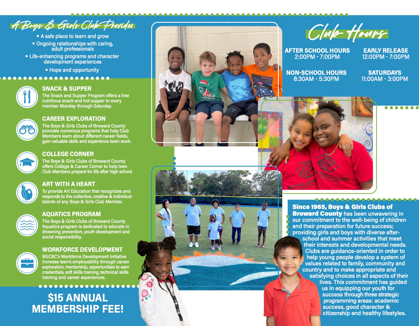 This brochure was created to hand out to parents, members and prospective parents and members. It was created as a way to have the activities offered at all of the clubs in one convenient place.
