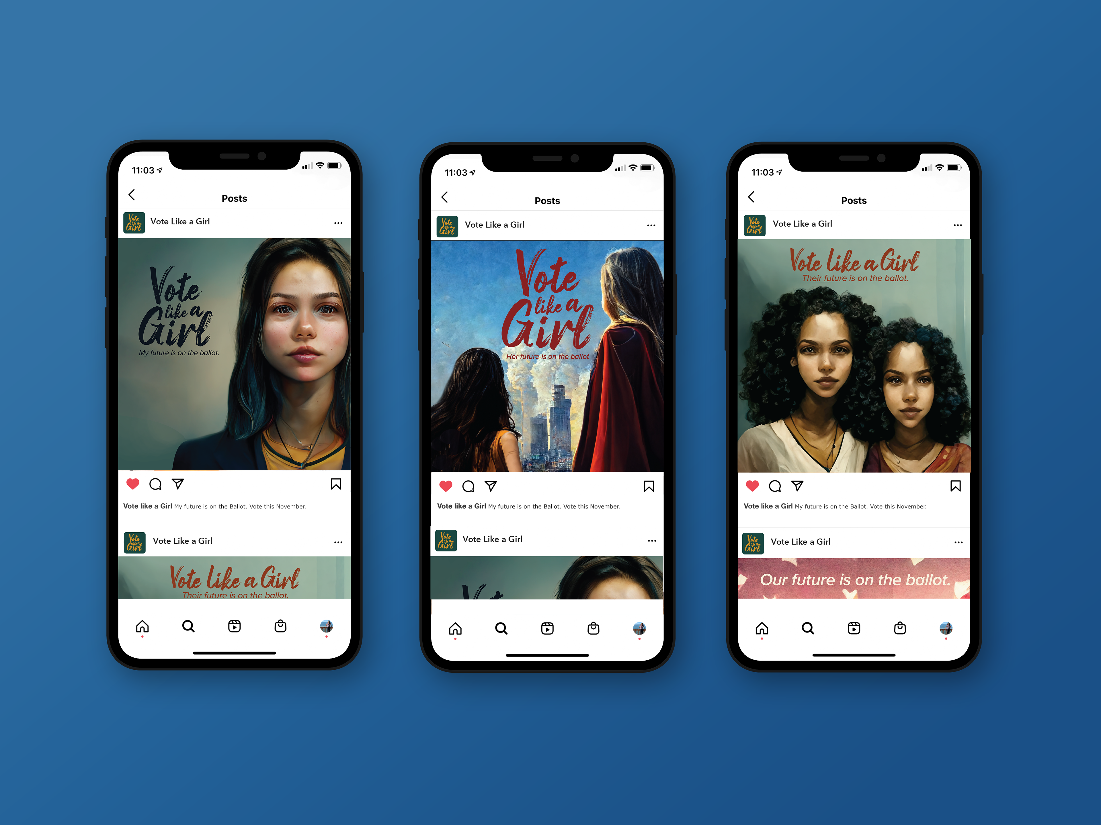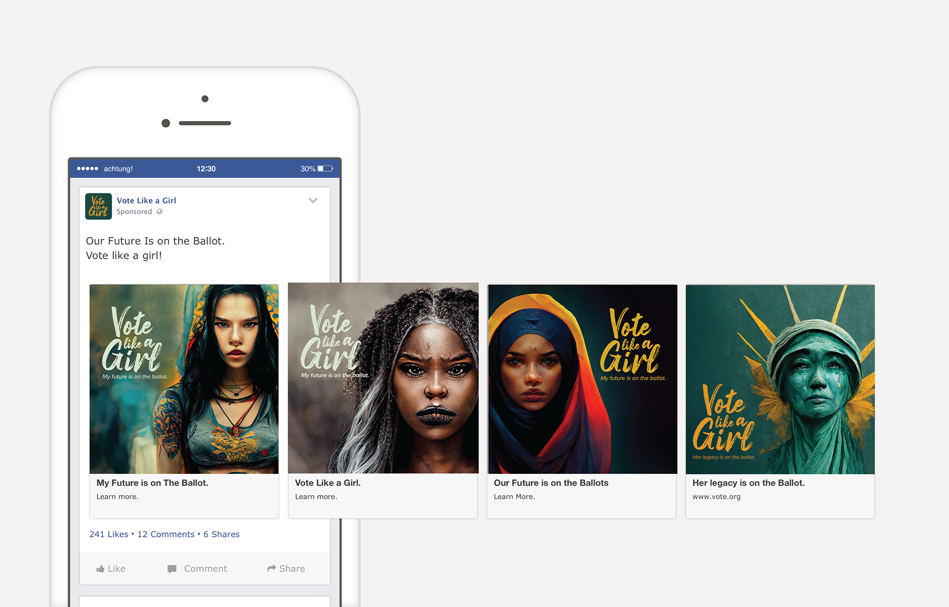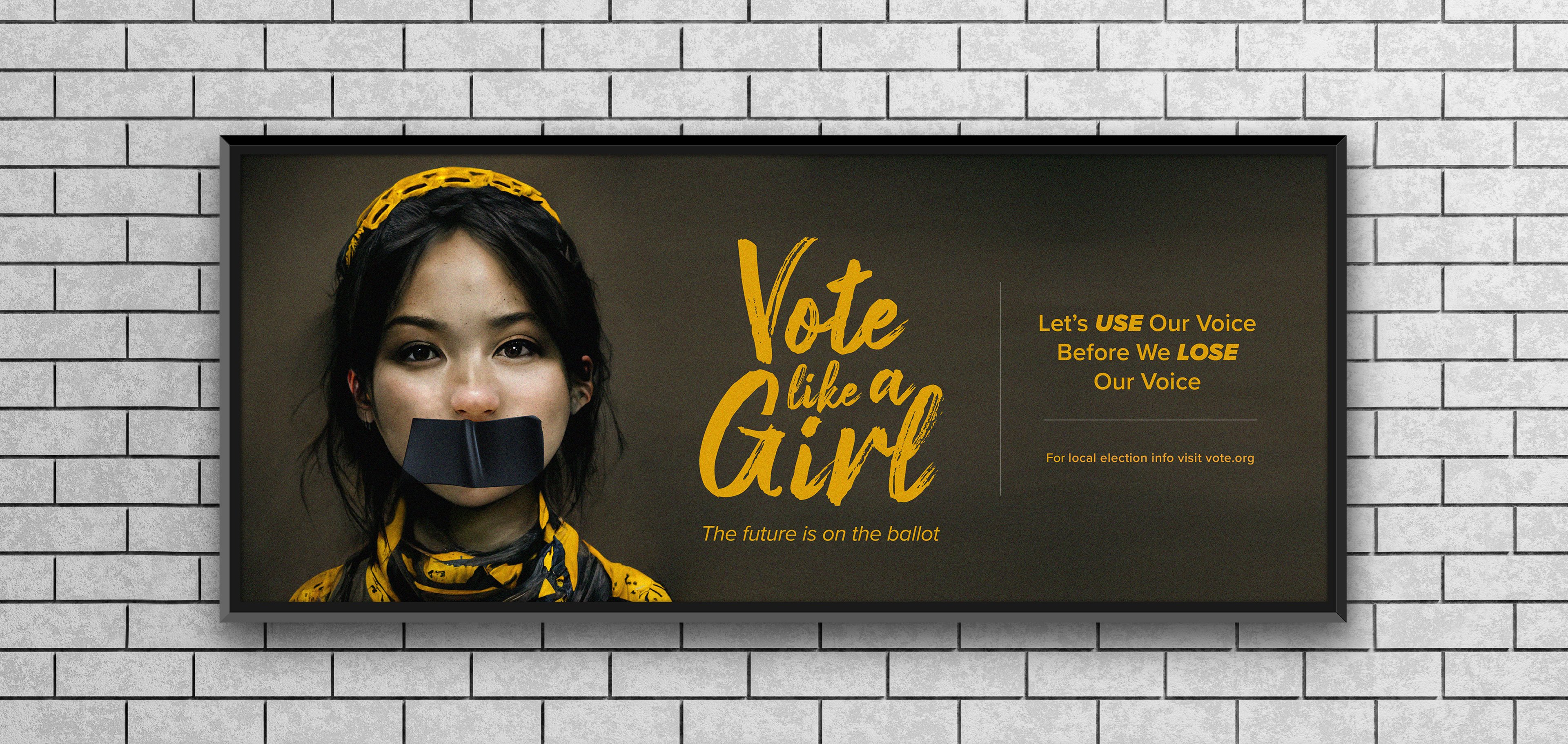 Vote Like a Girl - Brand Identity/Marketing Campaign (spec project). This project was created using a combination of the ai bot midjourney and the adobe softwares.